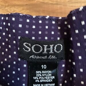 Dark blue with white polka dots zip up with 2 faux rear pockets with flare legs.