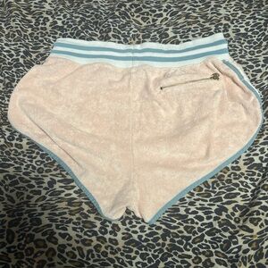 Pink and blue velour Champion shorts. Size medium.