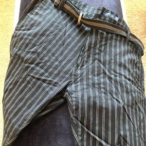 New, flat front shorts that are navy with white stripes. There is a blue fabric belt that can also be worn with other clothes. Size 38, 97% cotton, 2 side pockets and one back pocket. In need of an iron!