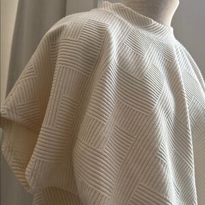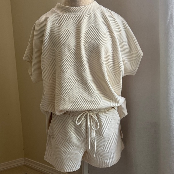 Stylish cream knit set featuring a textured pattern. Includes a short-sleeve top and drawstring shorts.
