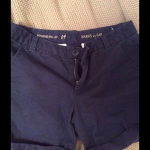 4 pairs of shorts: GAP light khaki "short shorts" with tags size 4, GAP boyfriend roll up navy blue size 4, aerie coral lightweight soft cotton size 4, and old navy black cotton shorts size 6