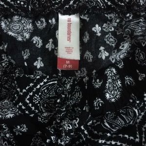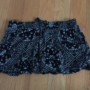 Pastel green shorts, flowy with elastic band waist. Patterned black and white shorts also flowy with elastic band waist. Both would fit a small/medium better, I’m a large and they stretch to fit but lose their “flow”.