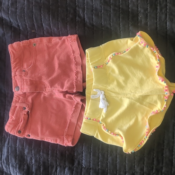 Both pairs are in excellent condition. Yellow are knot fabric pink ones are jeans and have an adjustable waist band.