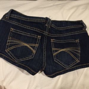 Dark washed shorts with thick embroidering! Super cute and short :) size 0 but can probably fit if you are a size 3