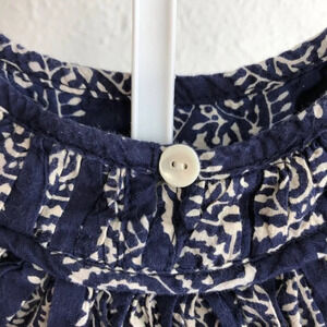 Blue and white pattern sleeveless shirt with gathered neckline, white bubble shorts with elastic waist and pockets, baby girl summer outfit, paisley, ikat, block print, tank top.