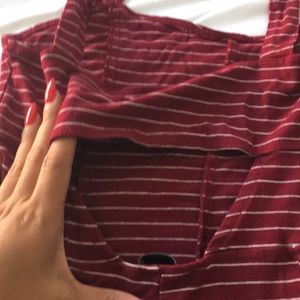 Only worn once. Cotton very soft and stretchy. Flowy. Not padded. Maroon red color with thin white stripes