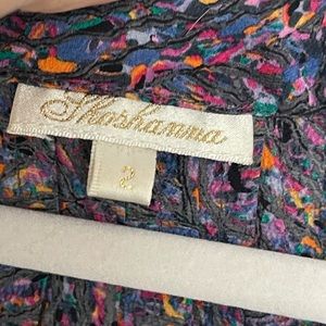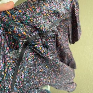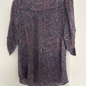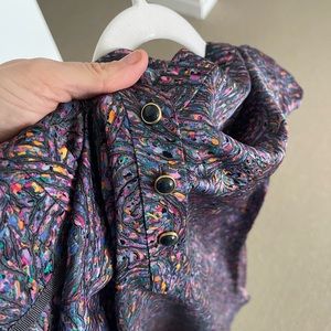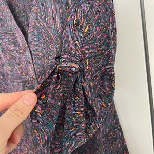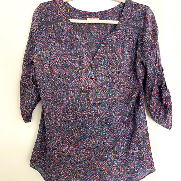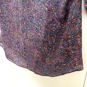 Beautiful purple pattern blouse . V neck With a few gold and black buttons on the top. price reflects gentle wear. Pattern is fun and speckled. Purples black pink orange in a whimsical oval pattern throughout.