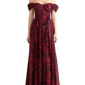 A graceful gown defined by a sultry off-the-shoulder neckline, a fit-and-flare silhouette, and two-tone printed design.
