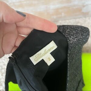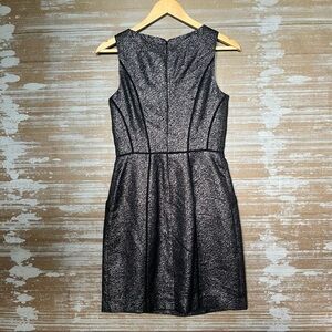 Sheath dress with a shimmering silver pattern. Sleeveless with exposed zipper. Super cute and lightweight fun dress.