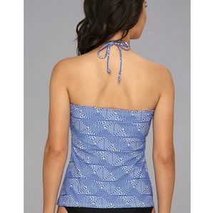 Printed Tankini Top ($132) features a gold ring accent at center of bust/adjustable halter straps/tie at back/built in elastic shelf bra / non-slip banding along top edge /lined for comfort/ 80% nylon 20% spandex lining: 98% Polyester 2% spandex/hand wash cold dry flat