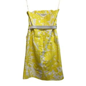 Strapless Shoshanna mini dress, yellow and white floral with a tropical vibe. Light boning in bodice. Cotton blend, sweetheart neckline, belted. Fully lined, pockets, back zipper closure.