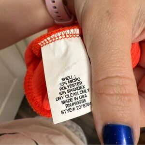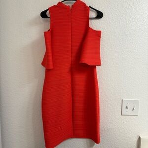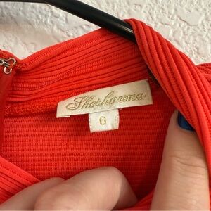 Elevate your style with this stunning Shoshanna Fillmore dress. The bright orange color, short cold shoulder sleeves, and high neckline with a zipper closure make it a perfect choice for any wedding or party occasion. The ribbed texture of the polyester and spandex material adds a unique touch, while the collarless design and mini length give a chic vibe.