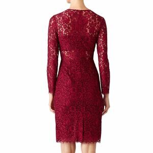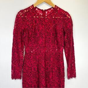 Shoshanna Garnet Illusion Lace Sheath Dress in Red. Crafted from delicate red lace, this dress features a sophisticated sheath silhouette. Features long sleeves and crew neckline. The partially lined design creates a subtle illusion effect. A hidden back zipper with a hook-and-eye closure ensures a seamless fit. Classic yet striking, this dress exudes effortless sophistication and romance.