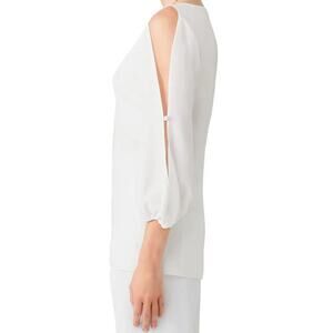 Shoulder-baring cutouts punctuate the billowy blouson sleeves of this crisp V-neck top by Shoshanna that evokes a sense of modern romance. White crepe (100% Polyester). Top. Three quarter sleeves with cold shoulders. V-neckline. 28.5" from shoulder to hemline.