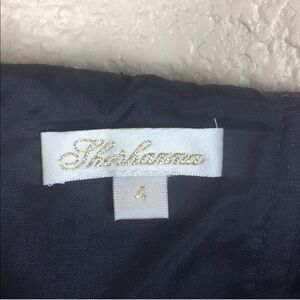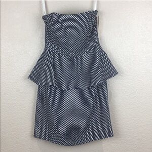 Park slope jacquard. Peplum dress in navy. Knit. Strapless. Straight neckline. Scoop back. Fitted bodice with seaming. Banded; peplum waist. Straight skirt. Hem hits above the knee. Back zip. Lined. Small back split.