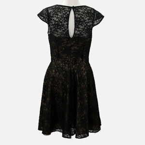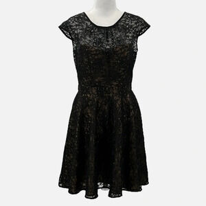 Shoshanna Lace Overlay Cap Sleeve Occasion Dress in Black & Tan - Size 4. Great pre-owned condition. Black lace overlay and sleeves with tan liner. In my opinion, it's between a brown and a tan. Liner has a sweetheart neckline and lace overlay is a round neckline with silk edging. Defined waistline with a fuller skirt. Cap sleeves, hidden back zipper with hook & eye closure, keyhole opening with button and loop closure at neckline. Occasion or cocktail dress. Approximate measurements: 16 1/2" pit to pit, 14" waist, 35" length from shoulder seam.