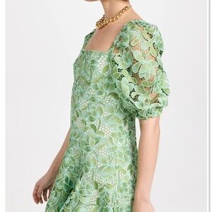 Shoshanna's resort collection features a green garden lace mini dress with a square neck and puff sleeves.