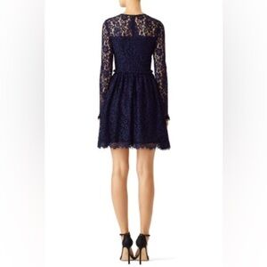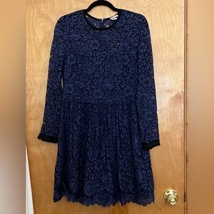 Elegant navy lace dress. Features long sleeves and a fitted waist. Perfect for formal occasions. Very good condition.