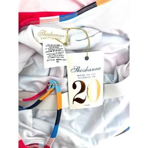 Shoshanna rainbow-striped one-piece. Scoop neckline. Adjustable straps. Scoop back. Moderate seat coverage. Nylon/spandex. Hand wash. Made in USA