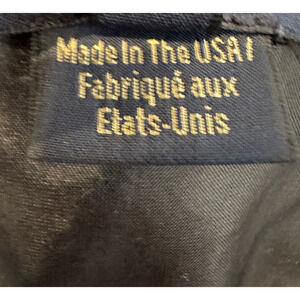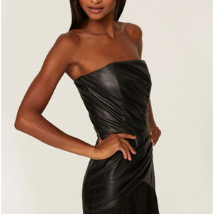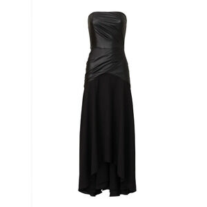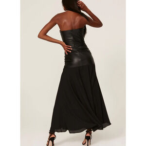 Black faux leather (88% Polyester, 12% Polyurethane), Georgette (100% Polyester). Sheath. Strapless. Straight neckline. Back zipper closure. 50" from top to hemline. Made in the USA