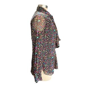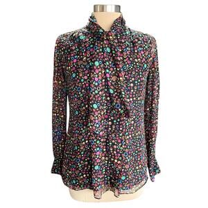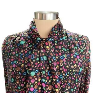 Shoshanna Silk Blouse Black Multicolor Geometric Circle Print Size 4 Career Wear. Sheer silk with lined bodice. Sleeves unlined. Neck has self tie. The left side of the blouse has button at shoulder and hidden snap opening. In excellent preowned condition.