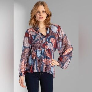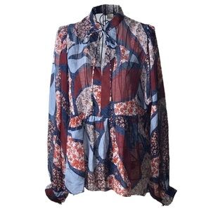 Shoshanna Silk Chiffon Floral Paisley Patchwork Tie Neck Blouse