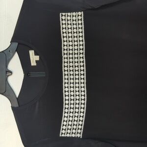 Black with white crochet insets. Long sleeves. Zip back. Excellent condition -- no stains, rips, or fraying. Pit to pit measurement: 18 inches. Length shoulder to hem: 34.5 inches.