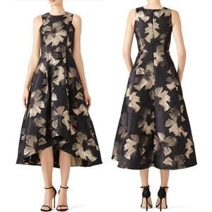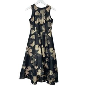 Shoshanna Size 0 Black & Gold Coraline Jacquard Hi Low Hem Midi Dress Party