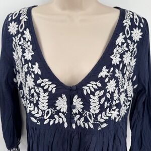 Keywords: Shoshanna, tunic top, embroidered, floral, bohemian, navy blue, dress, size S, cotton, long sleeve, v neck, casual dress, summer dress, beach dress, vacation dress, swim coverup