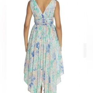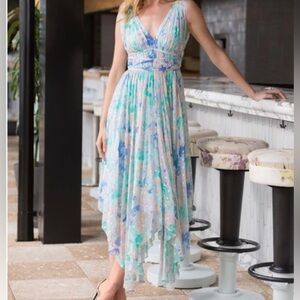 Bought for a wedding and never wore. This dress is stunning. It’s a handkerchief style dress with its uneven hem. The neckline is the same in the back and front with a plunging v-neck. It also has a beautiful tie (attached to dress) which accents the waist nicely. The midline of dress is stretchy. The print is a blue, watercolor like style with sparkling silver rectangle shapes throughout.