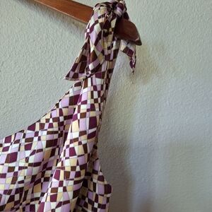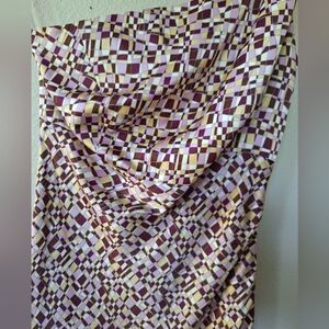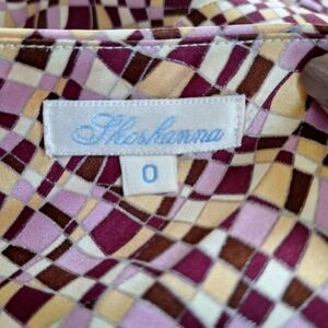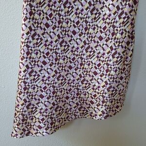 Shoshanna Sheath Dress. One Shoulder accented with tie closure. Side zip closure. 100% Silk. Lavendar, plum, ivory and tan geometric print. Asymmetrical hem. Lined. Womens size 0 Pit to pit flat lay 14.5" length from pit to longest point on hem 35" measurements are approximate