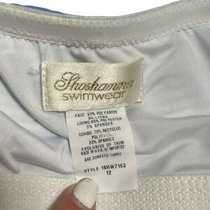 Chic and beach-ready, this Shoshanna Swimwear tankini top features a vibrant blue and white stripe pattern with a front keyhole ring detail. The removable halter strap allows you to wear it strapless, and the built-in interior grip strip helps keep it securely in place. Full lining and ruching at the sides offer a flattering and comfortable fit—perfect for your next poolside or vacation look.
