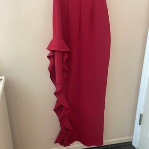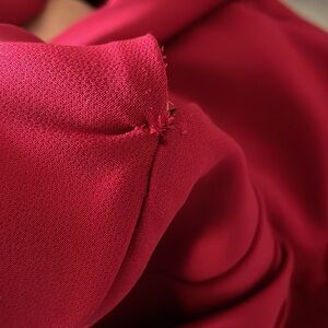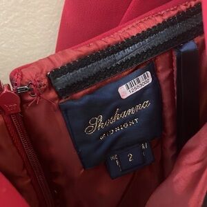 Red crepe (92% Polyester, 8% Polyurethane). Gown. Cap sleeves. Off the shoulder neckline. Hidden back zipper with hook-and-eye closure. Partially lined. Boned bodice. See size and fit tab for length. Made in the USA.