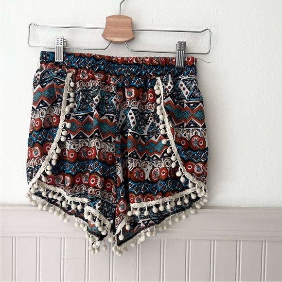 Shosho High Waist Geometric Patterned Shorts with Pom Pom Trim medium