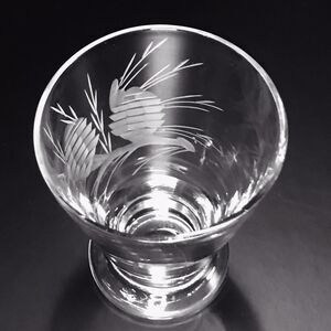 Add some vintage charm to your barware collection with this set of four shot glasses. Each glass is adorned with an etched and painted pinecone design, adding a touch of nature to your drinking experience. The clear glass and normal glass type make it perfect for serving cold beverages, and the 3.25 inch height is just right for a refreshing shot.
