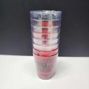 This set of 8 plastic vodka shot glasses is perfect for Valentine's Day celebrations. Each glass features a fun 'Be My Valentine' design. New and durable, they are ideal for parties or as a romantic gift.