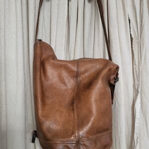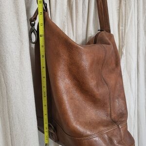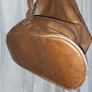 Leather shoulder bag, one large pocket with no lining or additional pockets. Can be worn two different ways depending on how strap is placed. Broken-in soft leather, made in Columbia. See photos for details.