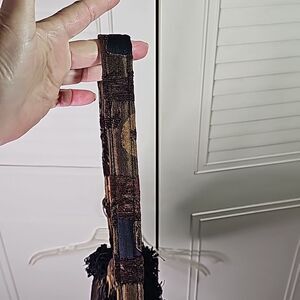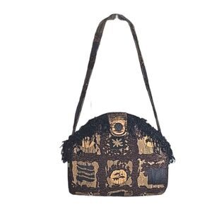 Shoulder Bag Brocade Material Brown Tan Black , no interior pockets, satin style lining Black, magnetic closure, cute Eyelash style trim, Size 11.5" x 4" x 8.5", in good condition.