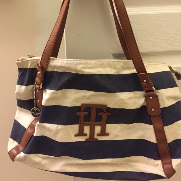Tommy Hilfiger navy blue and white striped bag. The blue is alittle faded out in the back part of the bag. Other than that it's in pretty good condition 🛍
