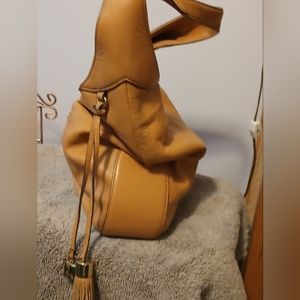 New, leather, tassel detail, single shoulder strap, piston snap closure, back wall zipper pocket, two front wall zip pockets