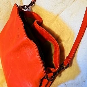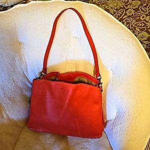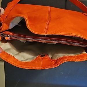 Very soft Italian leather shoulder bag. Single removable strap but not adjustable. Interior has 3 compartments, 2 outer compartments snap to the inner compartment which has a zip closure.