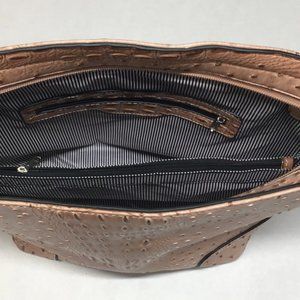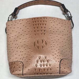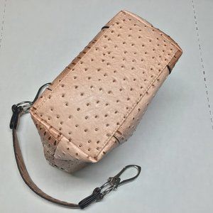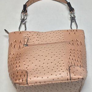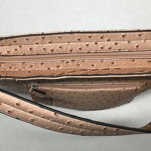 The bag has a carrying strap with golden-tone hardware, fabric interior with 2 inside zip pockets. Faux leather. Preowned in almost like new condition.