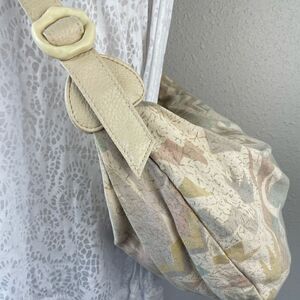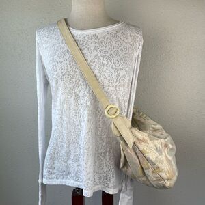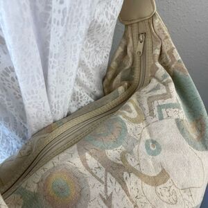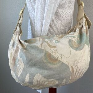Super cute cotton shoulder bag featuring a faux leather adjustable strap. It measures 18 inches I. Length and 11 inches in height.