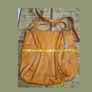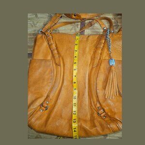 Big, Beautiful. Hobo Chick with Supple Soft, gorgeous orange color leather. Adjustable Strap makes it an easy conversion from shoulder to Cross-body. Bag has a lot of room and pockets, has a soft light sheen in the prominent areas that develops through use which provides character to the bag.Handle drop 4”. Adjustable strap, set to 15”, can be larger. Exterior Pockets 9” x 9”.