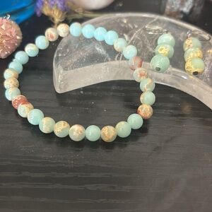This listing is for a stretch bracelet made of 6 mm Shoushin jade beads, and earrings made of 8mm beads. To the Chinese Shoushin Jade is known as the Beginners Mind. It is used to help one facilitate an open mind ready for learning and growth. It is also a really pretty light teal with brown inclusions. I love this jade because even the site of it is cheerful and child like.