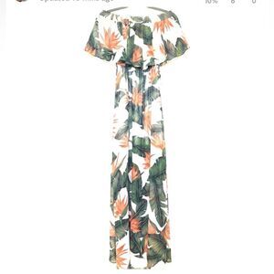 This lush paradise print will be love at first sight. Blues and greens on the soft green-gray are great for lots of skins tones and hair colors. The tropical foliage will leave everyone smiling! Pair with simple jewelry, this print can hold its own. The Hacienda Maxi and her pretty ruffle top will be flattering on everyone. The elastic neckline allows you to wear this dress off the shoulder, strapless, and one shoulder making it one of the most versatile dresses we have ever seen. There is also an elastic waistband that allows the dress to flow beautifully to the ground.