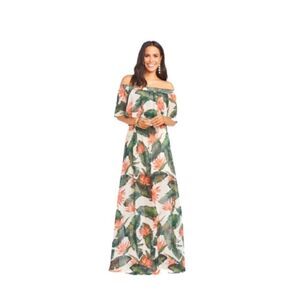This lush paradise print will be love at first sight. Blues and greens on the soft green-gray are great for lots of skins tones and hair colors. The tropical foliage will leave everyone smiling! Pair with simple jewelry, this print can hold its own. The Hacienda Maxi and her pretty ruffle top will be flattering on everyone. The elastic neckline allows you to wear this dress off the shoulder, strapless, and one shoulder making it one of the most versatile dresses we have ever seen. There is also an elastic waistband that allows the dress to flow beautifully to the ground.