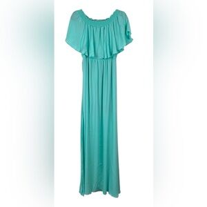 This stunning aqua maxi dress by Show Me Your MuMu is perfect for a wedding guest or prom occasion. It features a ruffled off-the-shoulder neckline and a thigh-high slit, adding elegance and movement to its flowing silhouette. The sleeveless design and flutter sleeves enhance its airy, sundress style.