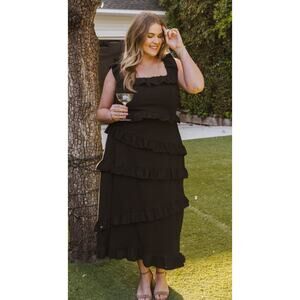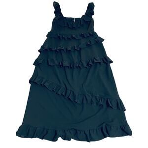 Elegant black midi dress with layered ruffles. Sleeveless design. Perfect for any occasion.