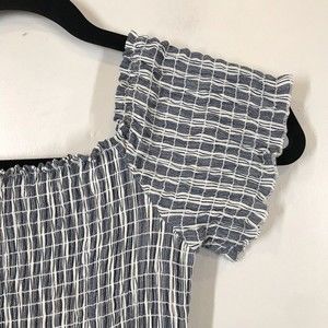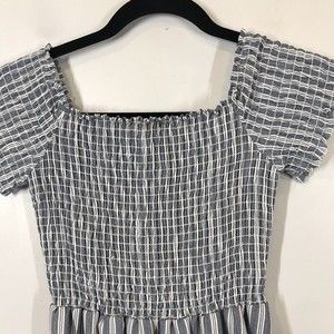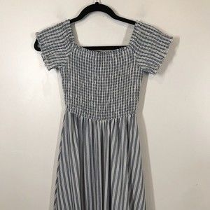 Chic high low dress with black and white stripes. Features a smocked bodice and short sleeves. Perfect for casual outings.